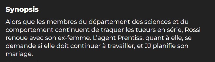 Alors que les membres du département des sciences et du comportement continuent de traquer les tueurs en série, Rossi renoue avec son ex-femme. L’agent Prentiss, quant à elle, se demande si elle doit continuer à travailler, et JJ planifie son mariage.