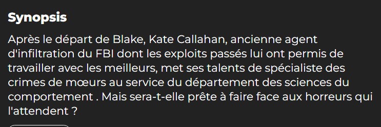 Après le départ de Blake, Kate Callahan, ancienne agent d'infiltration du FBI dont les exploits passés lui ont permis de travailler avec les meilleurs, met ses talents de spécialiste des crimes de mœurs au service du département des sciences du comportement . Mais sera-t-elle prête à faire face aux horreurs qui l'attendent ?