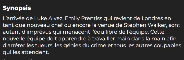 L’arrivée de Luke Alvez, Emily Prentiss qui revient de Londres en tant que nouveau chef ou encore la venue de Stephen Walker, sont autant d’imprévus qui menacent l’équilibre de l’équipe. ...